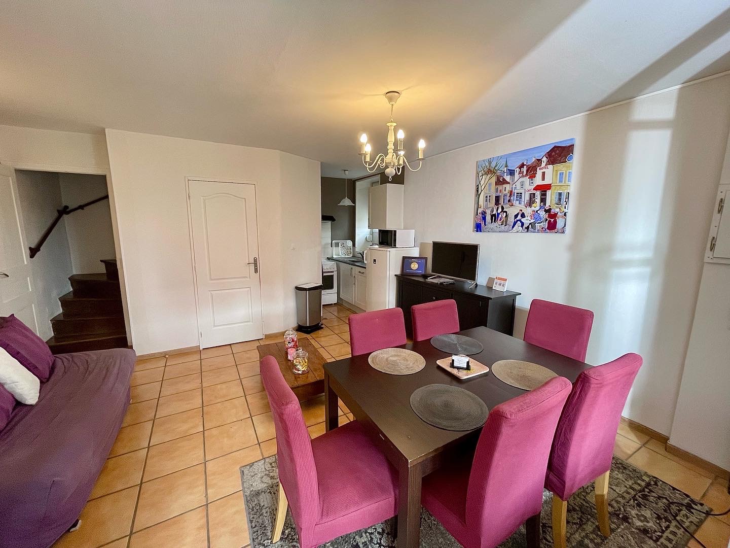 - Au rez-de-chaussée : un salon-salle à manger lumineux, un canapé-lit Bultex 160×200 pour deux personnes, une cuisine entièrement équipée avec four, micro-ondes, lave-vaisselle, cafetières, ustensiles et service à raclette, ainsi qu’une salle de bain moderne avec douche et lave-linge.